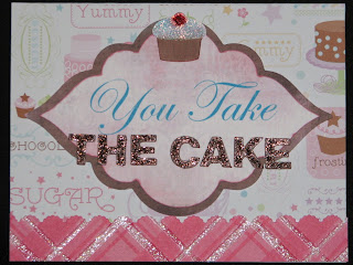 After making many, many birthday cards, I look for unique greetings on the front of the card. When I saw this in the Yummy cartridge folder, I thought it would be great for a card. I cut the front in layers...the background is one layer in brown, the layer of pink with the words You Take, and the words THE CAKE the top layer. I used Stickles to give dimension to the cupcake and the words Background paper and border are from DCWV stack Sweet, and border punch by EK Success.